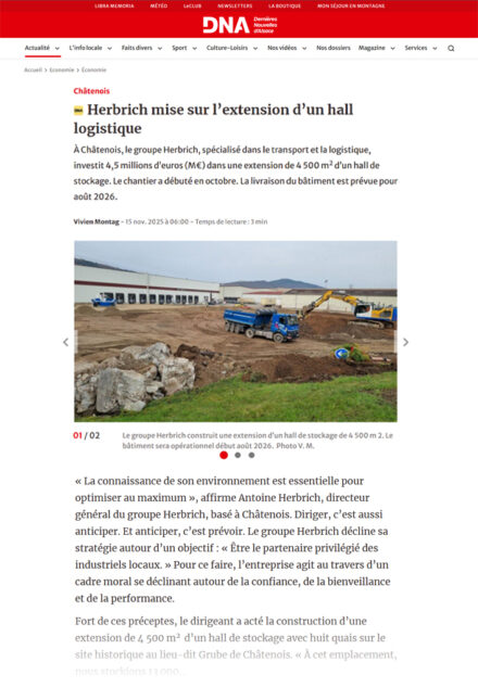 À Châtenois, le groupe Herbrich, spécialisé dans le transport et la logistique, investit 4,5 millions d’euros (M€) dans une extension de 4 500 m2 d’un hall de stockage. Le chantier a débuté en octobre. La livraison du bâtiment est prévue pour août 2026.